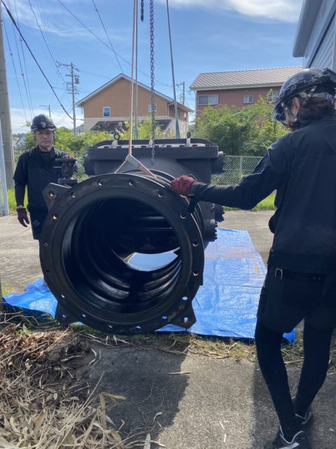 常滑市某所の雨水ポンプ場において、老朽化した伸縮可撓管およびチェッキ弁の撤去工事を実施いたしました。設備更新工事の第一段階として、既設配管部材を慎重に取り外す作業を行いました。